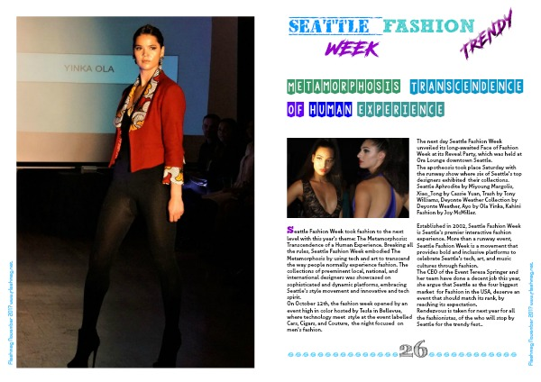 seattle Fashion Week took fashion to the next level with this year's theme: The Metamorphosis: Transcendence of a Human Experience. Breaking all the rules, Seattle Fashion Week embodied The Metamorphosis by using tech and art to transcend the way people normally experience fashion. The collections of preeminent local, national, and international designers was showcased on sophisticated and dynamic platforms, embracing Seattle's style movement and innovative and tech spirit.