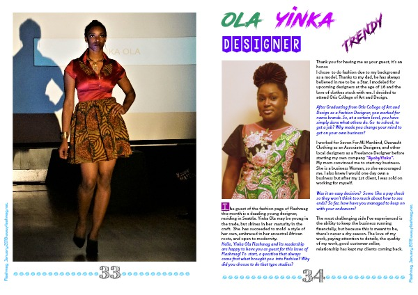 The guest of the fashion page of Flashmag this month is a dazzling young designer, residing in Seattle. Yinka Ola may be young in the trade, but shines in her maturity in the craft. She has succeeded to mold a style of her own, embraced in her ancestral African roots, and open to modernity.