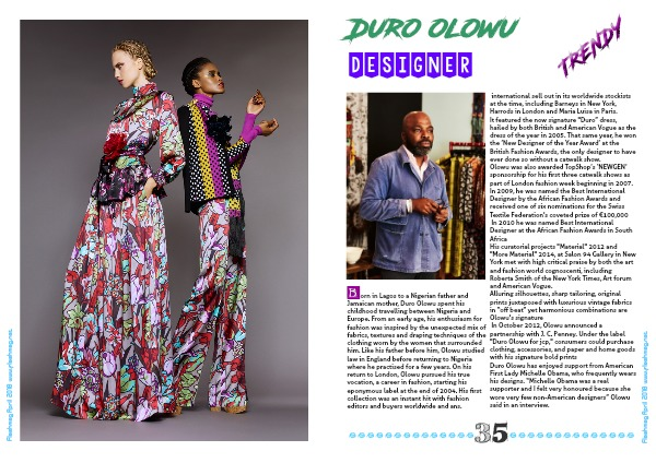Born in Lagos to a Nigerian father and Jamaican mother, Duro Olowu spent his childhood travelling between Nigeria and Europe. From an early age, his enthusiasm for fashion was inspired by the unexpected mix of fabrics, textures and draping techniques of the clothing worn by the women that surrounded him. Like his father before him, Olowu studied law in England before returning to Nigeria where he practised for a few years. On his return to London, Olowu pursued his true vocation, a career in fashion, starting his eponymous label at the end of 2004. His first collection was an instant hit with fashion editors and buyers worldwide and ans.
