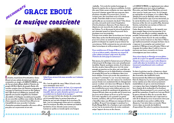 Écrivaine, musicienne & motivatrice. Grace Eboué est une artiste de talent qui vient de commettre un single « A SANGO’A MBOA », issu de Son prochain album dédié à l’histoire du peuple dit Noir. Égérie du peuple Bantu elle revisite certains pans de l’histoire poignante de son pays le Cameroun le tout sur des rythmes tels l’afro beat ou le Makossa, auxquels elle apporte une touche singulière les rendant abordable à l’échiquier mondial par la qualité de ses sonorités outillées avec métier. Au détour d’une causerie sur internet Grace Eboué a eu l’amabilité de nous accorder 5 minutes d’entretien pendant lesquelles elle nous a dit un peu plus sur sa personne et son art.